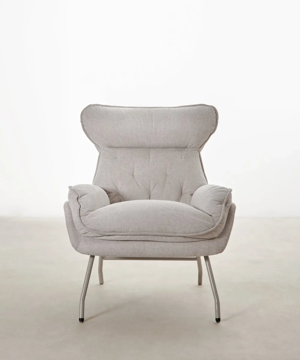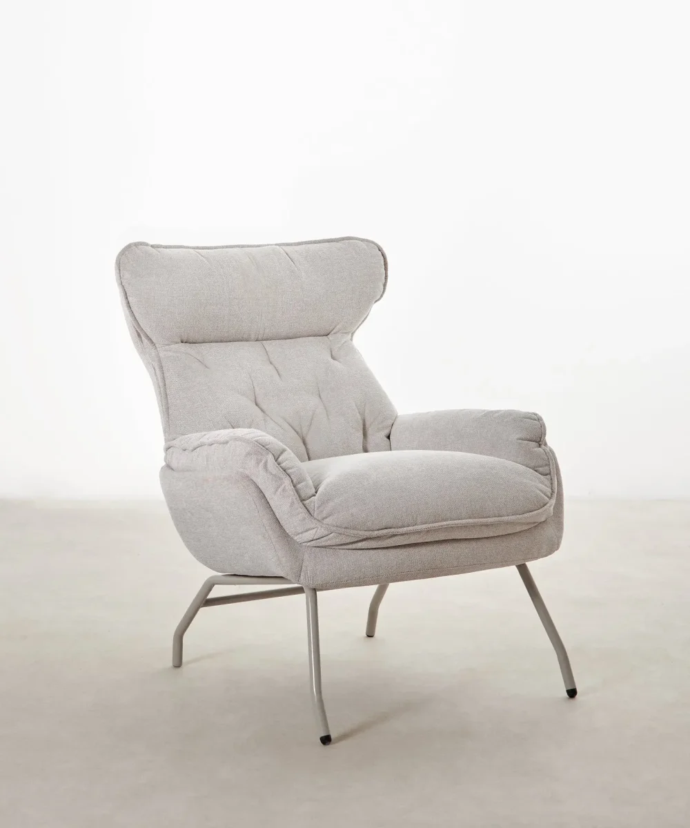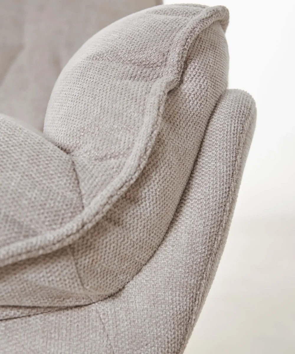 Está disponible en un tono beige neutro y cálido, tapizado en un tejido suave de textura agradable, fácil de combinar con distintos estilos decorativos. El diseño mullido y de formas suaves añade un toque acogedor a cualquier salón, dormitorio o rincón de lectura.