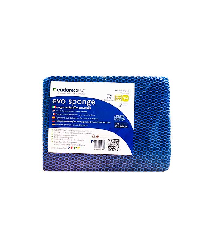 Spugna Antigraffio Evo Blu 4 Pezzi è adatto all’uso sulle superfici come: acciaio, teflon, ceramica, pentole, stoviglie, piani di lavoro. Brevetto MADE IN ITALY, idoneo al contatto alimentare. Sferattiva: all’interno della Spugna sono posizionate 9 sfere poliuretaniche che aumentano la forza applicata dalle dita sulle superfici.