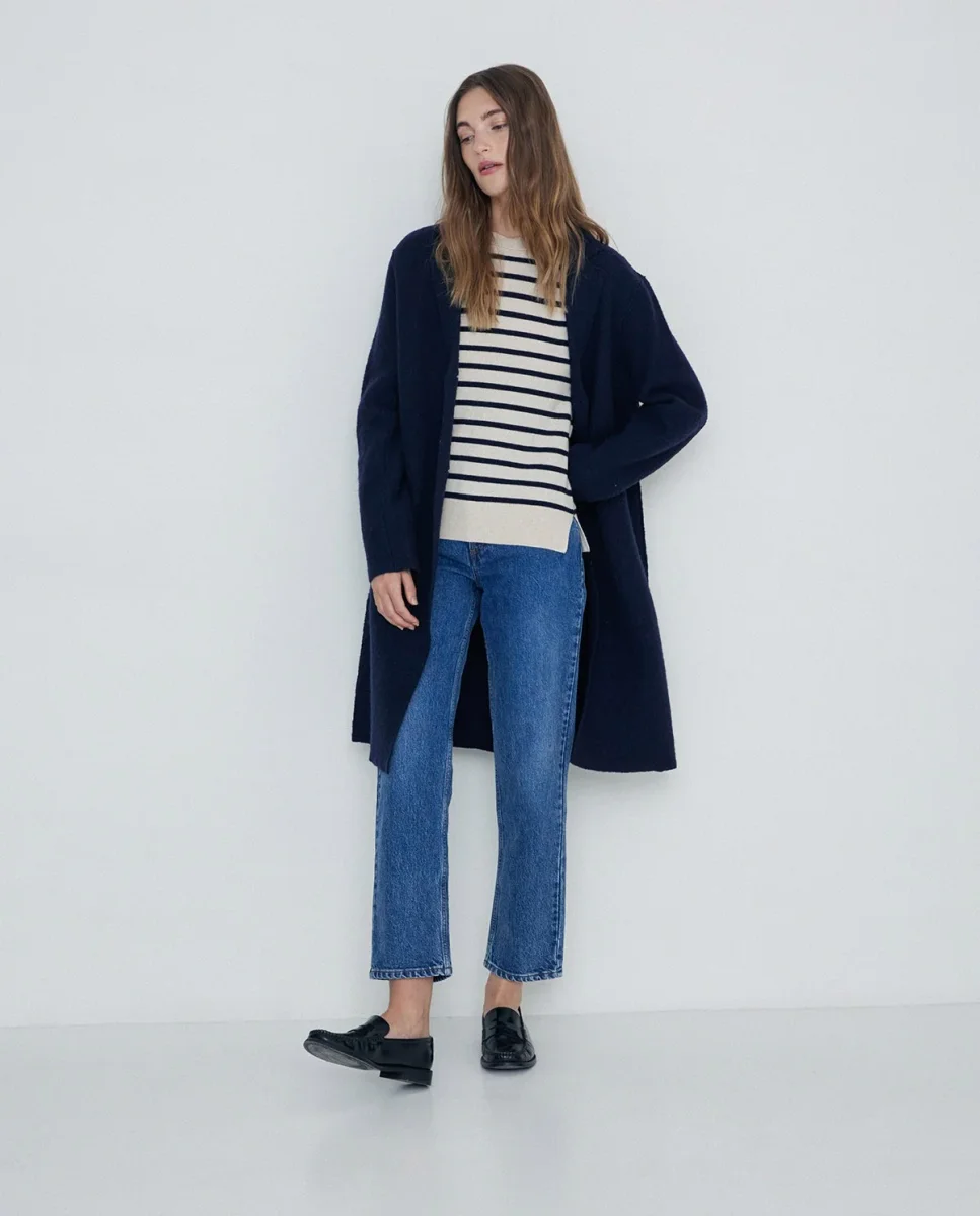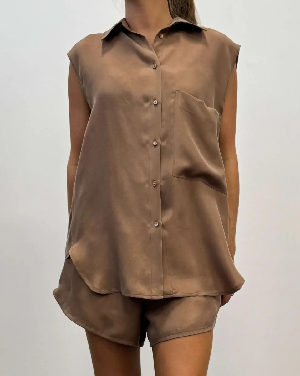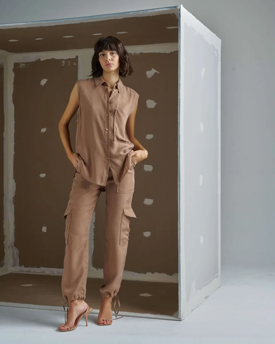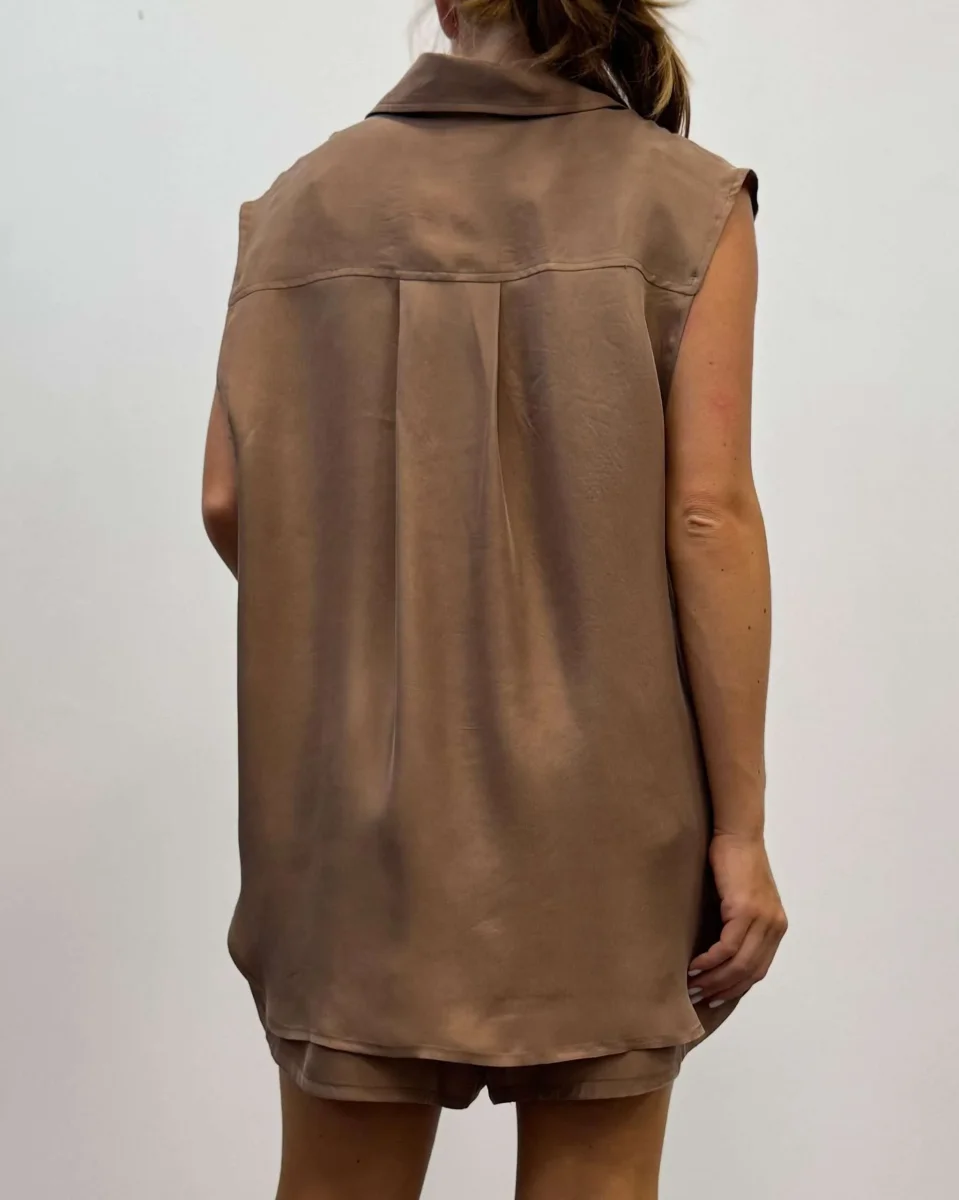Top senza maniche, realizzato in filato di viscosa. Collo a revers. Chiusura frontale a bottoni. Tasca all’altezza del petto.
